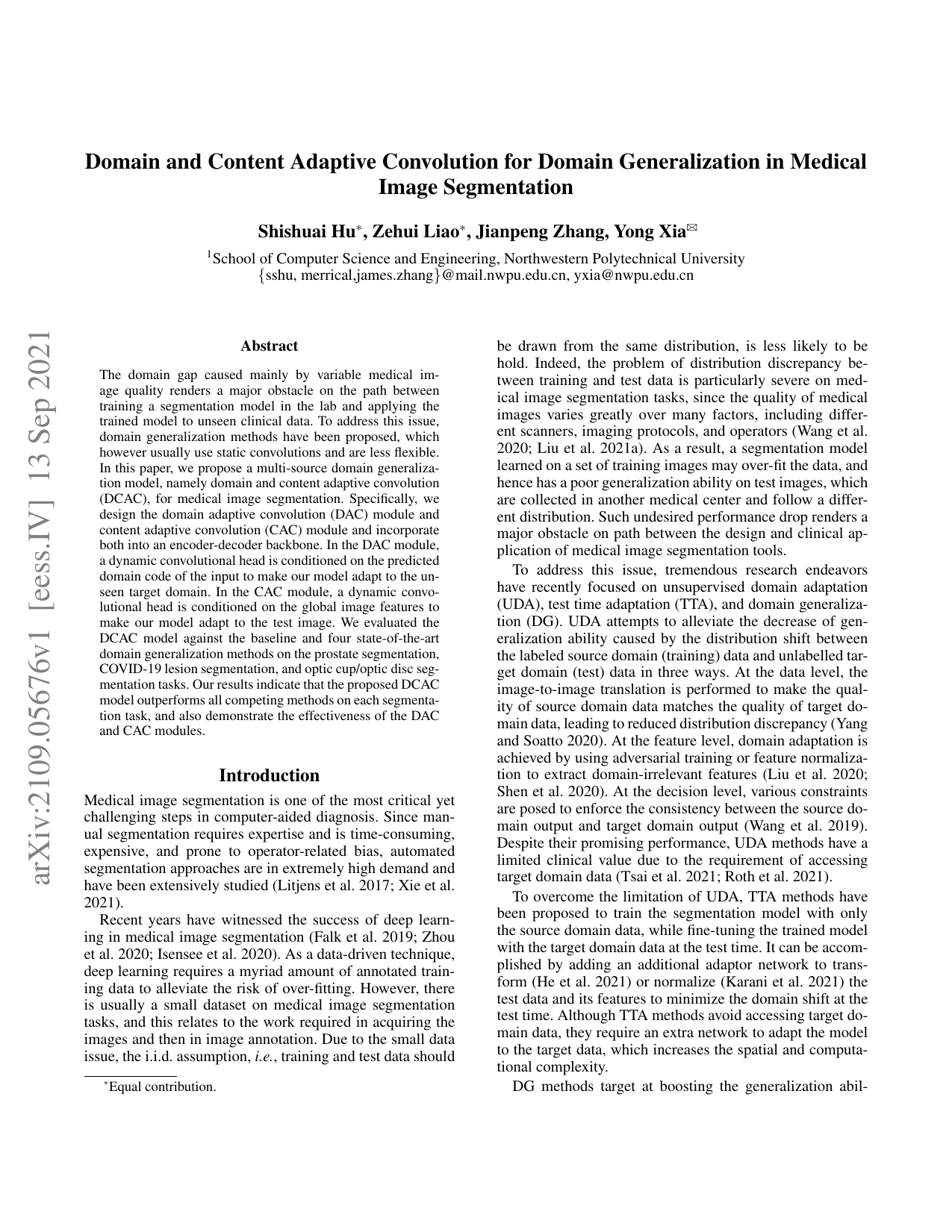 The domain gap caused mainly by variable medical image quality renders a major obstacle on the path between training a segmentation model in the lab and applying the trained model to unseen clinical data. To address this issue, domain generalization methods have been proposed, which however usually use static convolutions and are less flexible. In this paper, we propose a multi-source domain generalization model, namely domain and content adaptive convolution (DCAC), for medical image segmentation. Specifically, we design the domain adaptive convolution (DAC) module and content adaptive convolution (CAC) module and incorporate both into an encoder-decoder backbone. In the DAC module, a dynamic convolutional head is conditioned on the predicted domain code of the input to make our model adapt to the unseen target domain. In the CAC module, a dynamic convolutional head is conditioned on the global image features to make our model adapt to the test image. We evaluated the DCAC model against the baseline and four state-of-the-art domain generalization methods on the prostate segmentation, COVID-19 lesion segmentation, and optic cup/optic disc segmentation tasks. Our results indicate that the proposed DCAC model outperforms all competing methods on each segmentation task, and also demonstrate the effectiveness of the DAC and CAC modules.